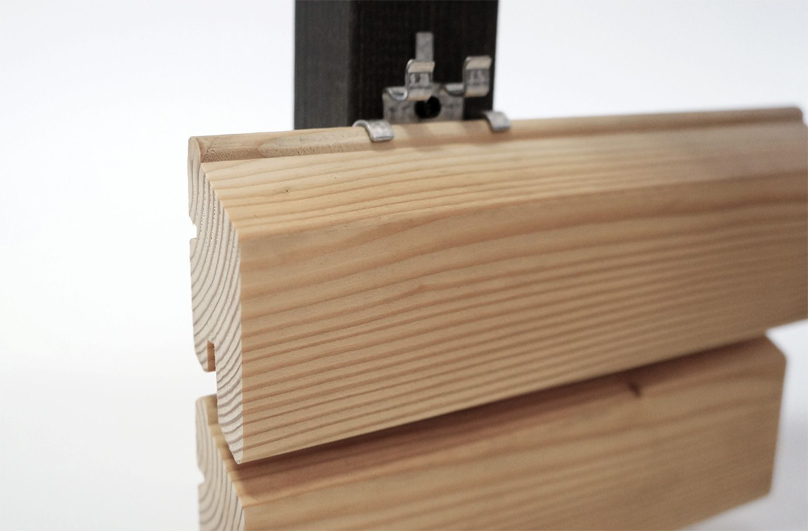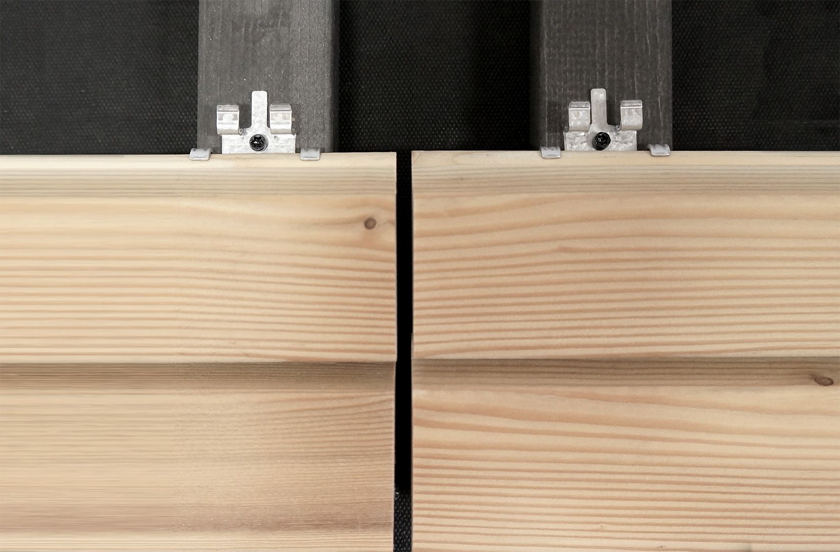 Das Befestigungssystem zeichnet sich durch eine Gleit- und Fixpunktmontage aus: Natürliches Quellen und Schwinden wird optimal und kontrolliert ausgeglichen.Wir bieten eine grosse Auswahl an verschiedenen Schweizer Holzarten, welche für das Fassadensystem verwendet werden können. Diese sind mit diversen Profilen erhältlich (3D-Effekt). Auf Kundenwunsch fertig behandelt oder mit Farbe lackiert.