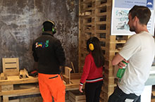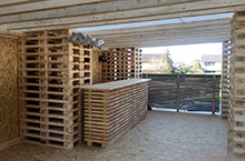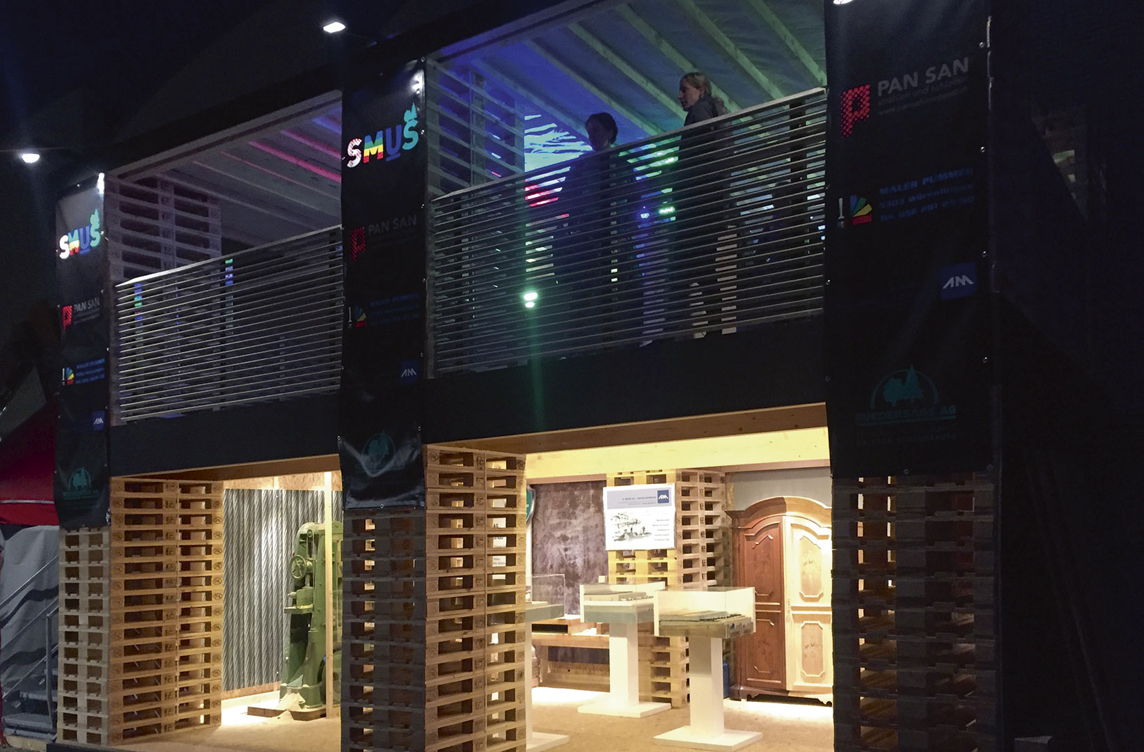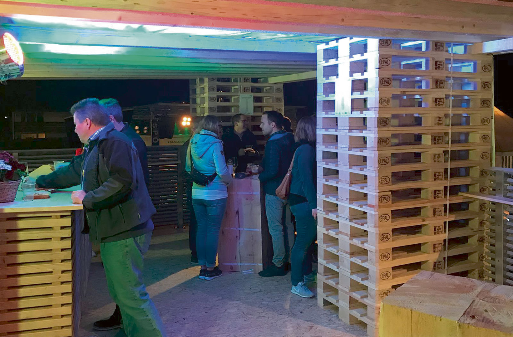 Der zweigeschossige Messestand wurde komplett aus Holzpaletten konstruiert und stellte einen attraktiven Blickfang auf der diesjährigen Gewerbeausstellung dar. Auf der oberen Ebene wurde für geladene Gäste eine hippe Bar gestellt.